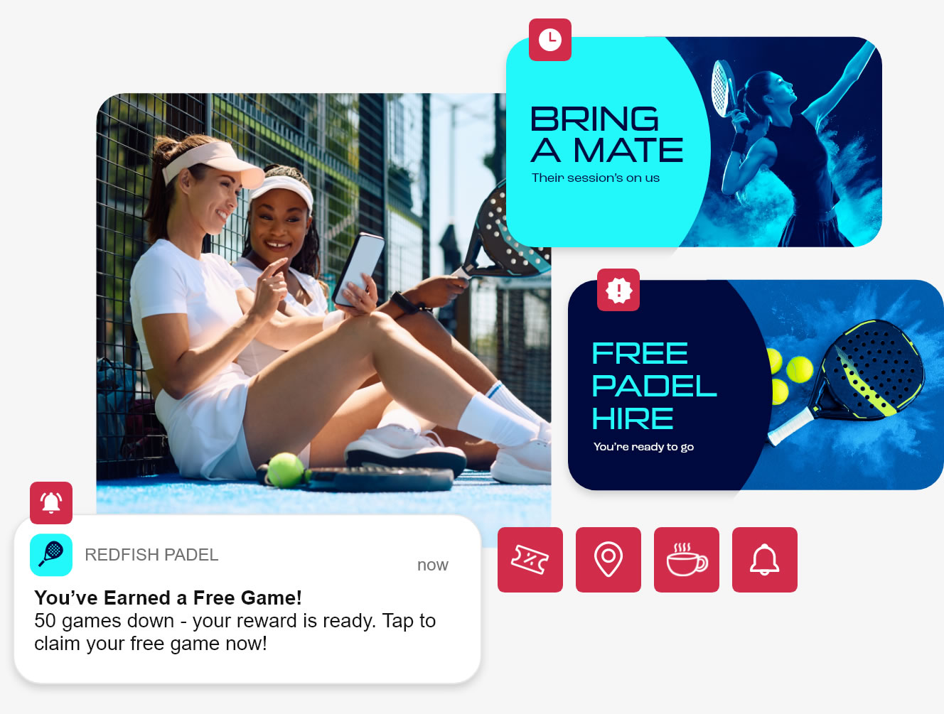 Redfish has the perfect solution – our white label loyalty app, designed with Padel in mind. It’s easy to use and can be customised to match your branding and how you want to reward your loyal players. It can integrate with Playtomic, or your current booking system, allowing groups to book and play whilst being rewarded. Plus, it’s packed with features that will help you grow your customer base, especially in a competitive market.